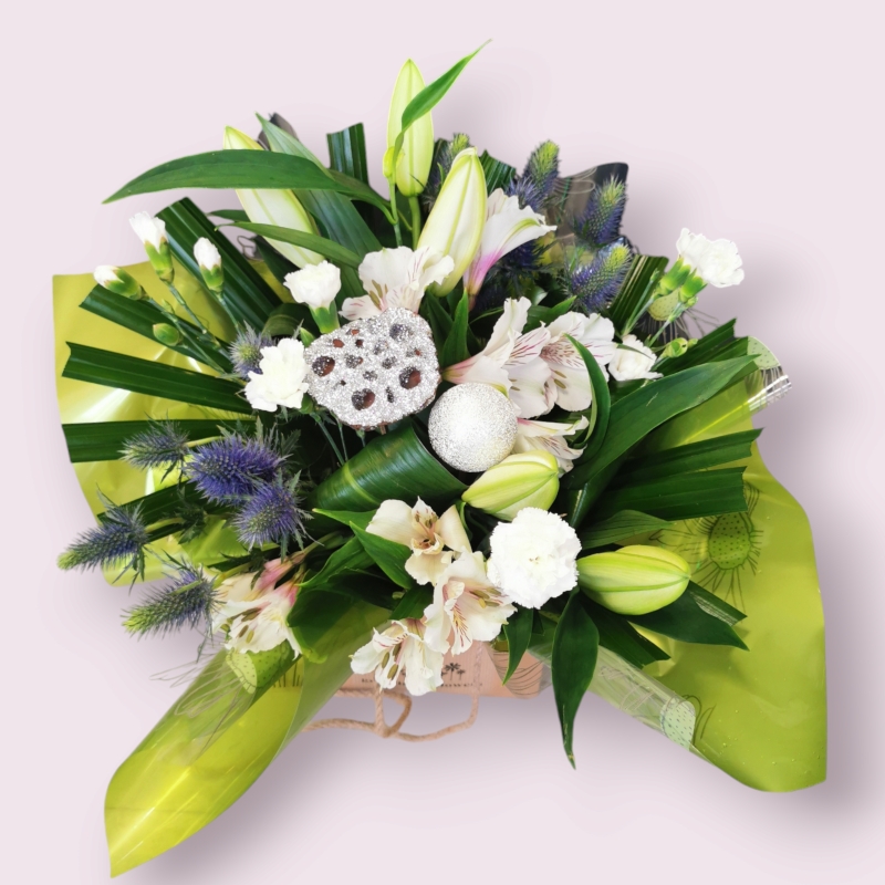 Snowy white flowers blend with greens and silvers to make this stunning wintery box arrangement. Seasonal flowers are selected and married with lush foliages.