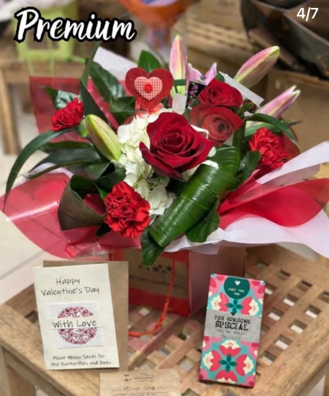 This bundle contains an arrangement of seasonal flowers with a valentine's theme and including one red rose. A bar of  milk chocolate with the message 'For someone Special' and an our little seed company Valentine's card.